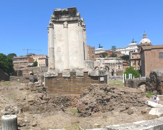 Před sloupy portiku nejvyšších bohů směrem do prostoru fóra se na vysoké podestě tyčí osm jónských sloupů. Tvořily průčelí chrámu zasvěcenému římskému bohu Saturnovi.